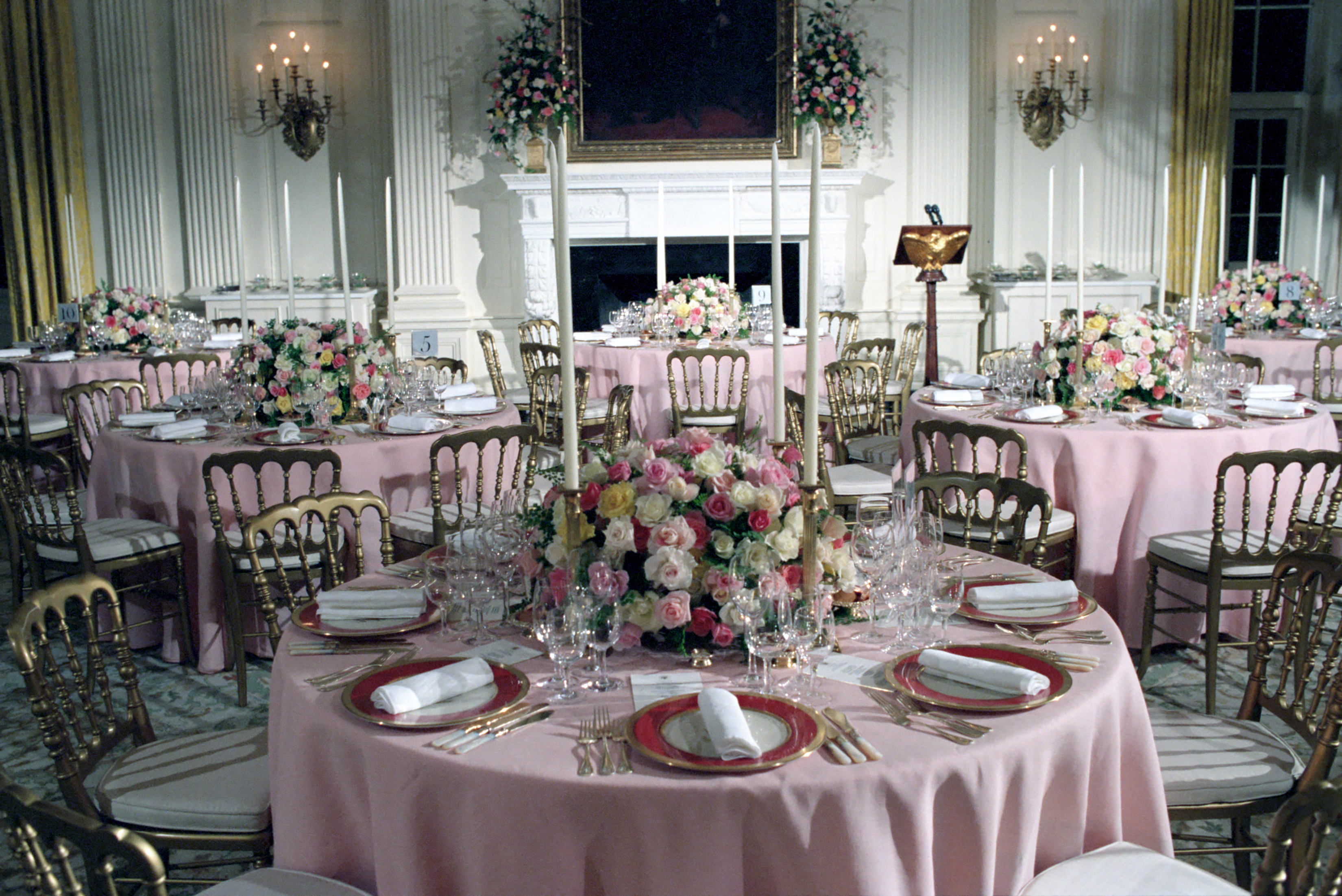 C31875 (01) 11/09/1985 … C31875 (01) … Table settings for Dinner for Prince Charles and Princess Diana of the United Kingdom … Washington, DC … China, table settings, flowers … State Dining Room … Souza …