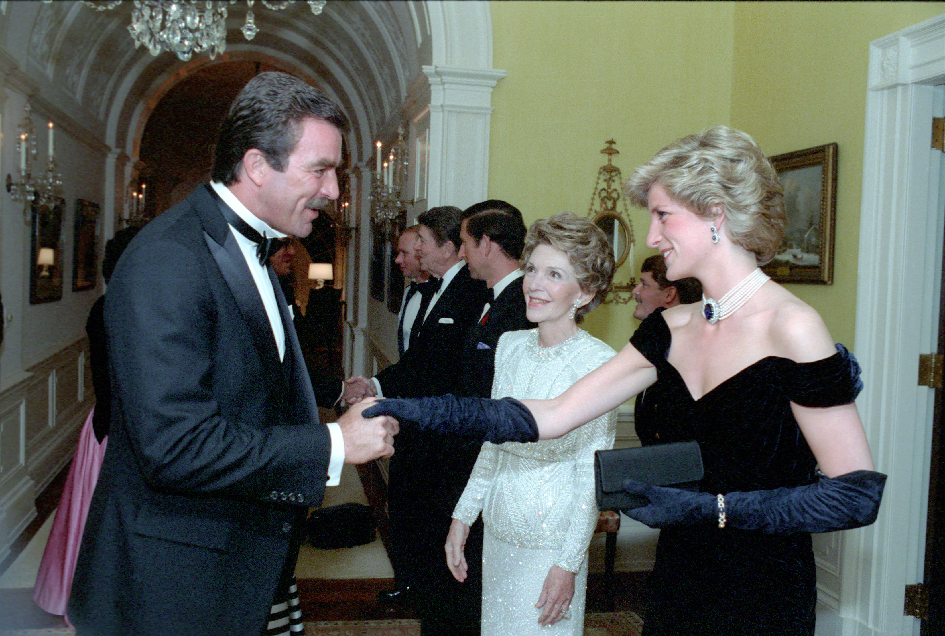 C31879 (02) 11/09/1985 … C31879 (02) … Dinner for Prince Charles and Princess Diana of the United Kingdom, Receiving Line … Washington, DC … shaking hands … Residence … President Reagan, Nancy Reagan, Princess Diana, Prince Charles, Jacques Cousteau, Tom Selleck, Gloria Vanderbilt, Jillie Mack, Malcolm Forbes, Moira Forbes Mumma, Drue Heinz, Steve Lundquist, J. Carter Brown … …