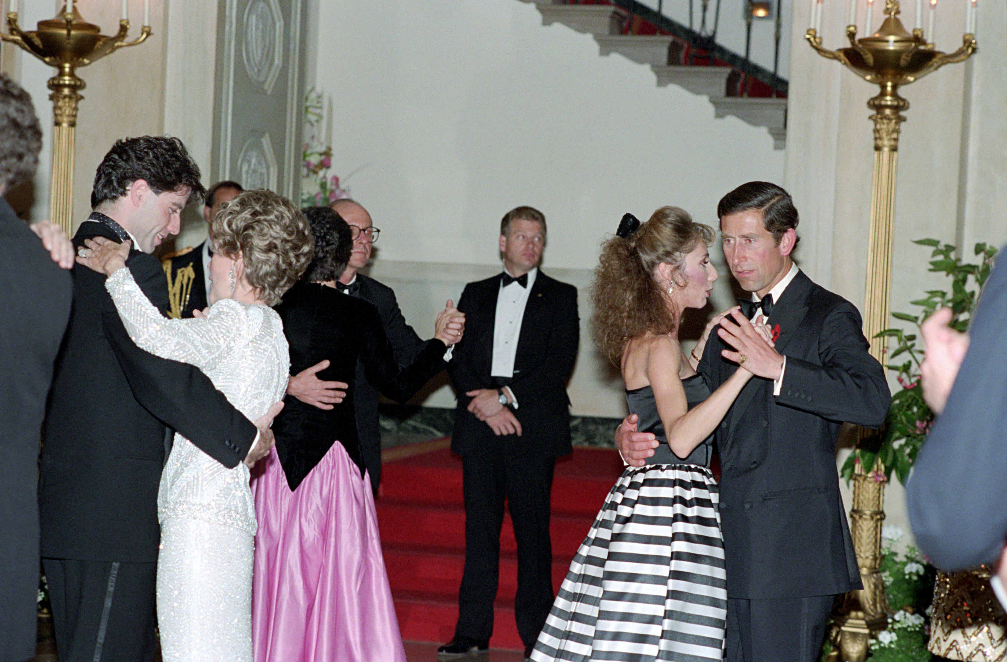 C31878 (01) 11/09/1985 … C31878 (01) … Dinner for Prince Charles and Princess Diana of the United Kingdom … Washington, DC … Dancing … Cross Hall … Nancy Reagan, Tom Selleck, Prince Charles, Princess Diana, Leonore Annenberg, Neil Diamond, Charles Price, Carol Price, Ted Graber, John Travolta … …