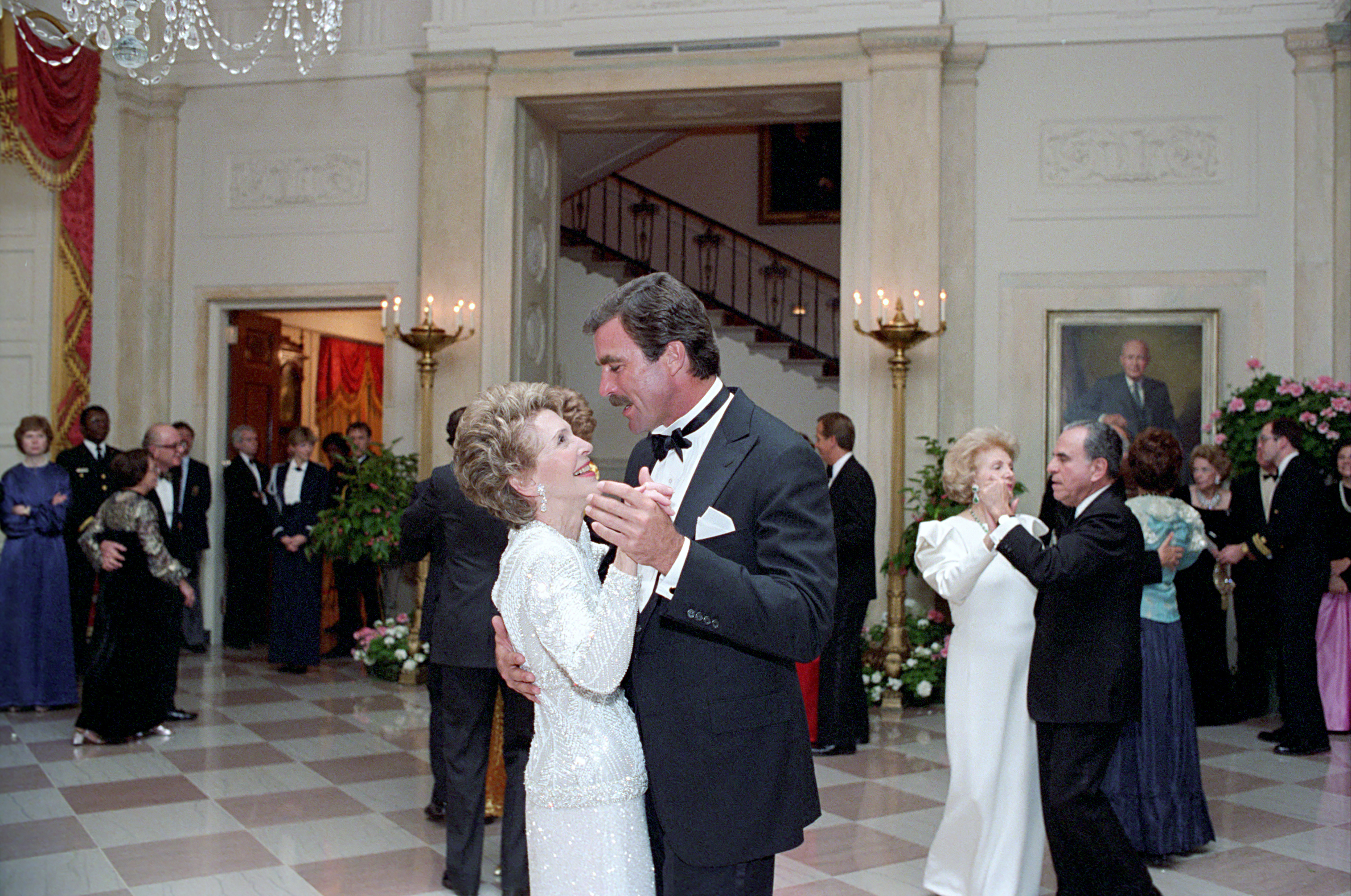 C31881 (02) 11/09/1985 … C31881 (02) … Dinner for Prince Charles and Princess Diana of the United Kingdom … Washington, DC … talking, Dancing … Cross Hall … President Reagan, Nancy Reagan, Clint Eastwood, Prince Charles, Princess Diana, Tom Selleck, Oliver Wright, Marjory Wright, Ted Graber, Charles Wick, Mary Jane Wick … …