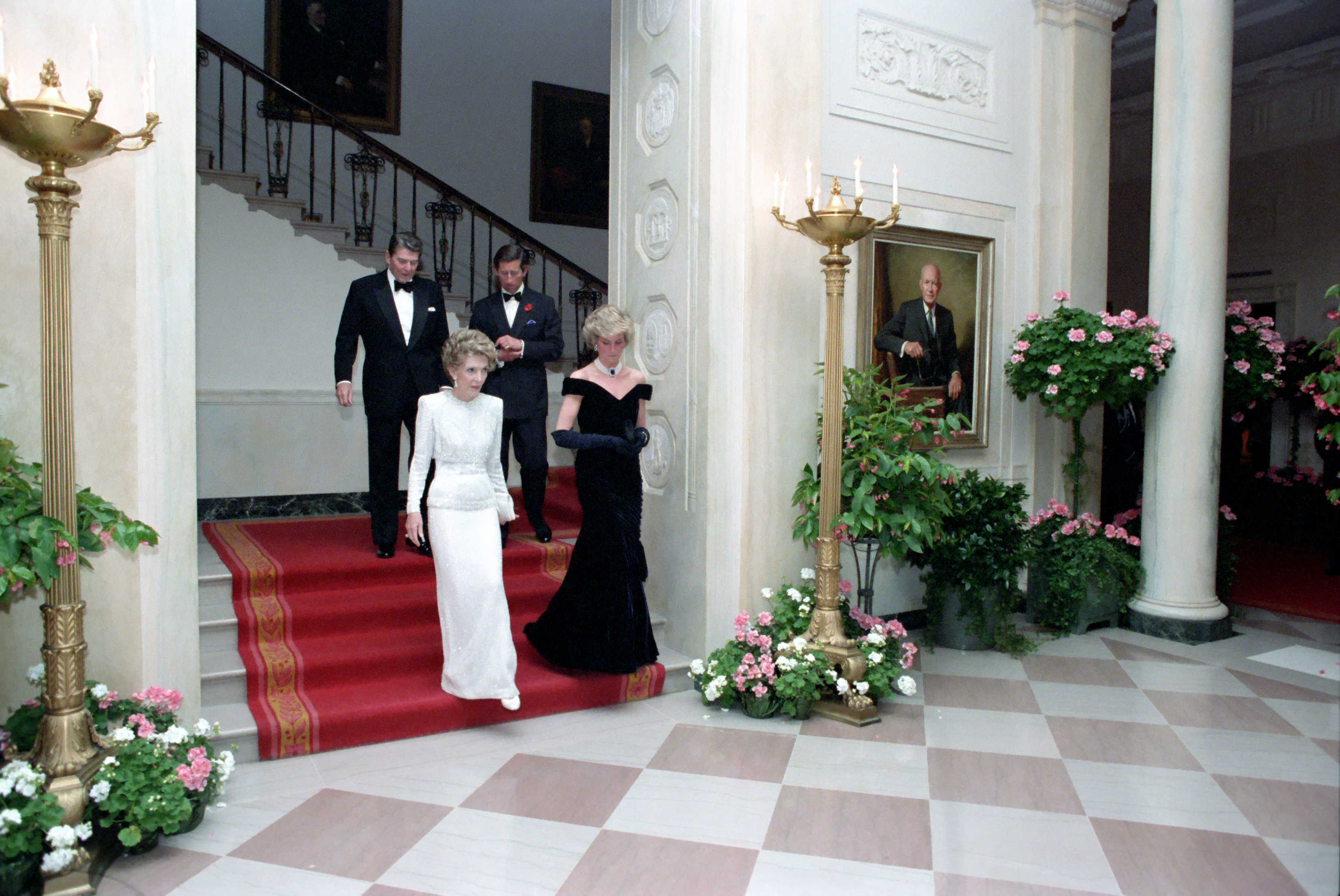 C31883 (03) 11/09/1985 … C31883 (03) … Dinner for Prince Charles and Princess Diana of the United Kingdom … Washington, DC … Dancing … Cross Hall … Nancy Reagan, Princess Diana, Prince Charles, Suzanne Farrell, John Travolta, Tom Selleck … …