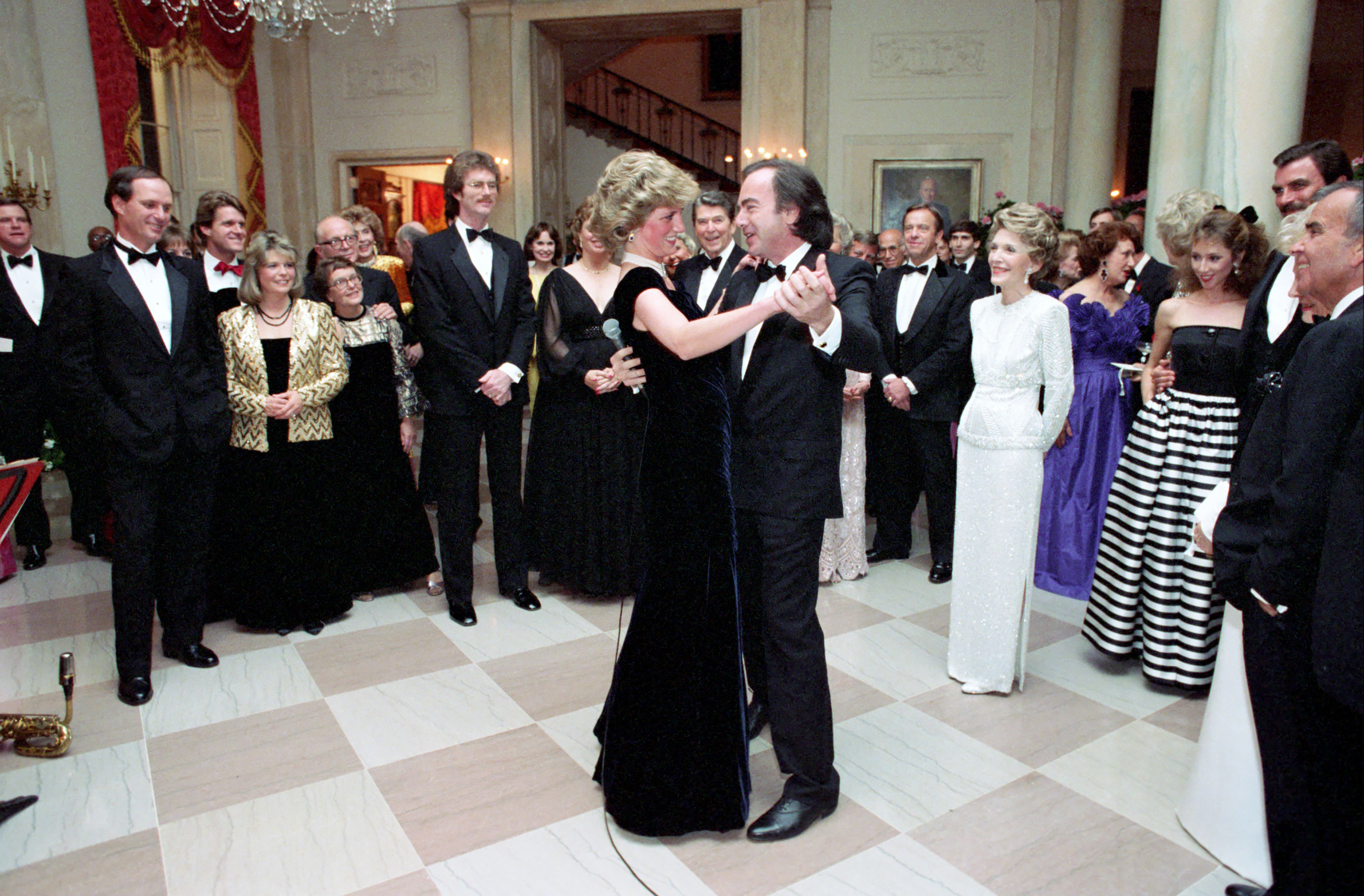 C31900 (03) 11/09/1985 … C31900 (03) … Dinner for Prince Charles and Princess Diana of the United Kingdom … Washington, DC … Dancing, singing … Cross Hall … President Reagan, Nancy Reagan, Princess Diana, Prince Charles, Neil Diamond, John Travolta … …