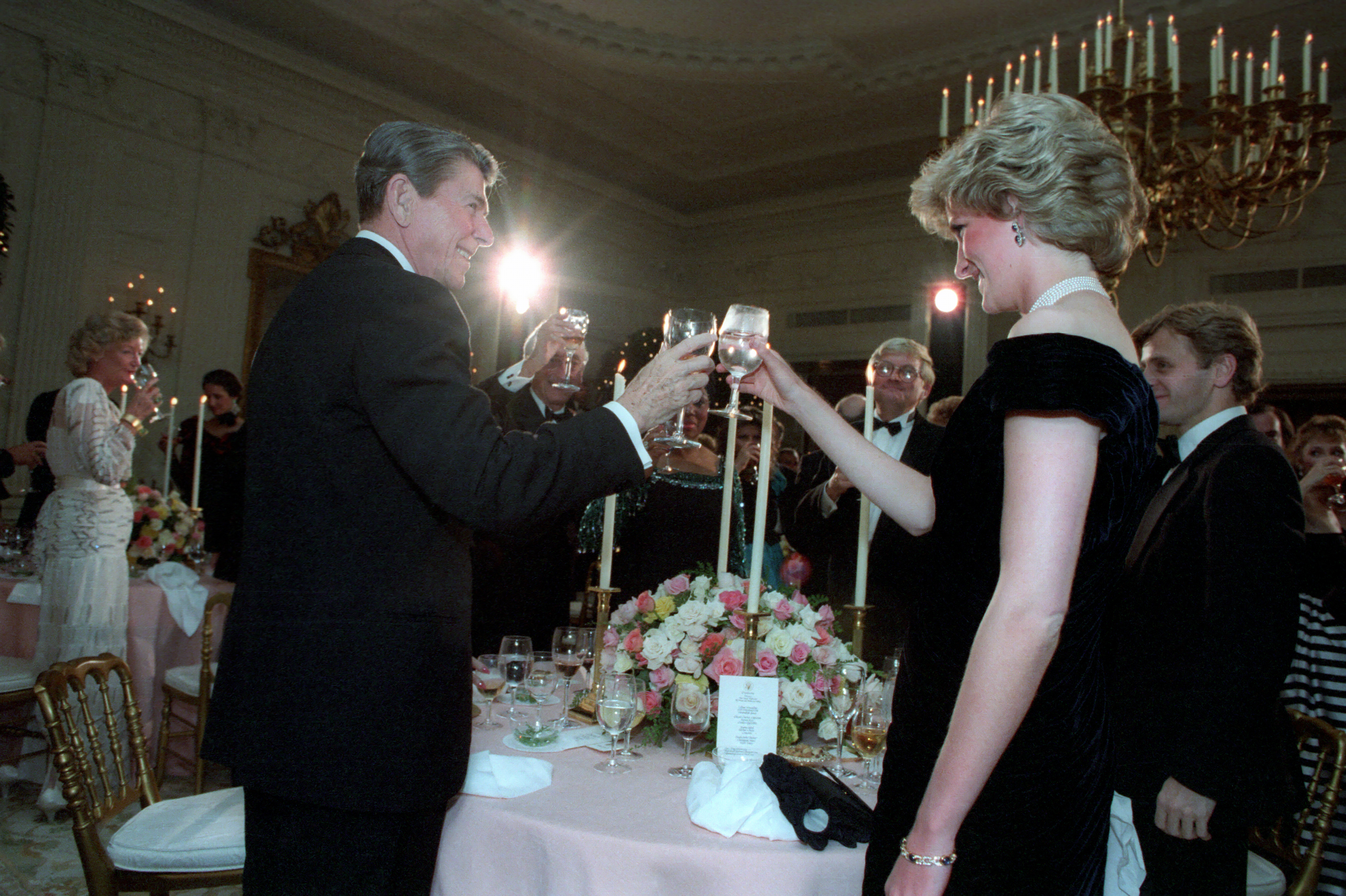 C31900 (01) 11/09/1985 … C31900 (01) … Dinner for Prince Charles and Princess Diana of the United Kingdom … Washington, DC … Toast, sitting, talking … State Dining Room … President Reagan, Princess Diana, Mikhail Baryshnikov, Leonore Annenberg … …