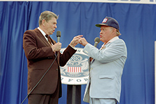 C40615 (03) 05/10/1987 … C40615 (03) … Trip to North Carolina, attending Bob Hope Salute to the United States Air Force 40th Anniversary celebration … Fayetteville, North Carolina … talking, holding microphone, saluting … Pope Air Force Base … President Reagan, Kirk Cameron, Brooke Shields, Don Johnson, Bob Hope, Lucille Ball, Barbara Mandrell, Emmanuel Lewis, Phyllis Diller, (Not in all Frames) …