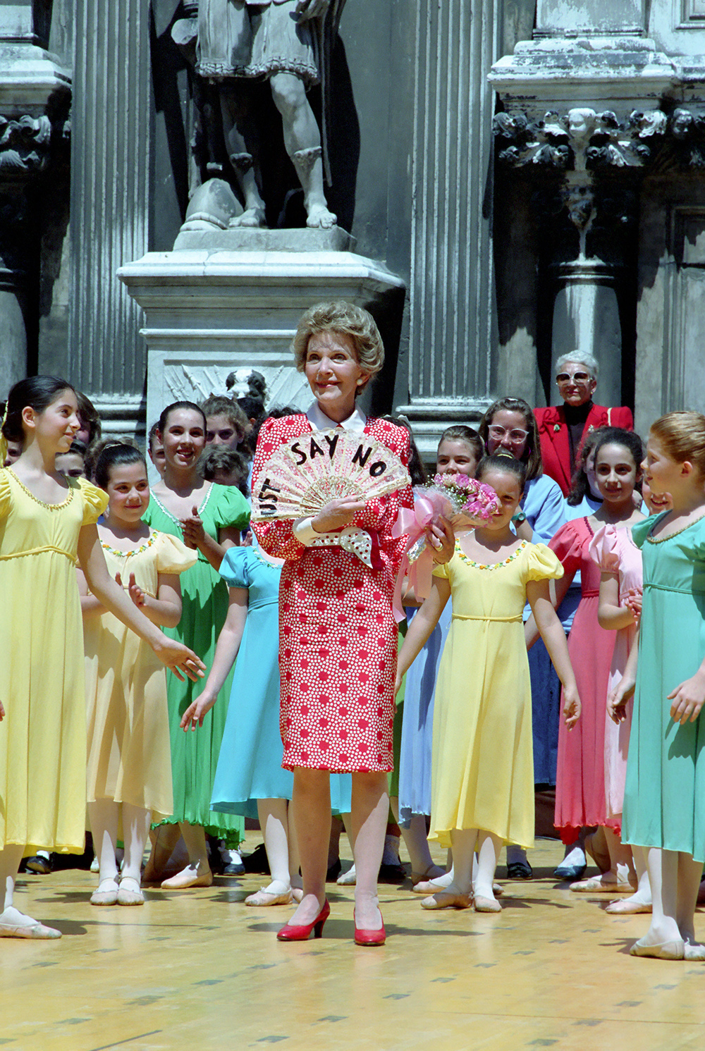 C41170 (01) 06/11/1987 … C41170 (01) … Trip to Italy, Arts and Crafts exhibit … Venice, Italy … children, dancing … Palazzo Ducale … Nancy Reagan … Fackelman …